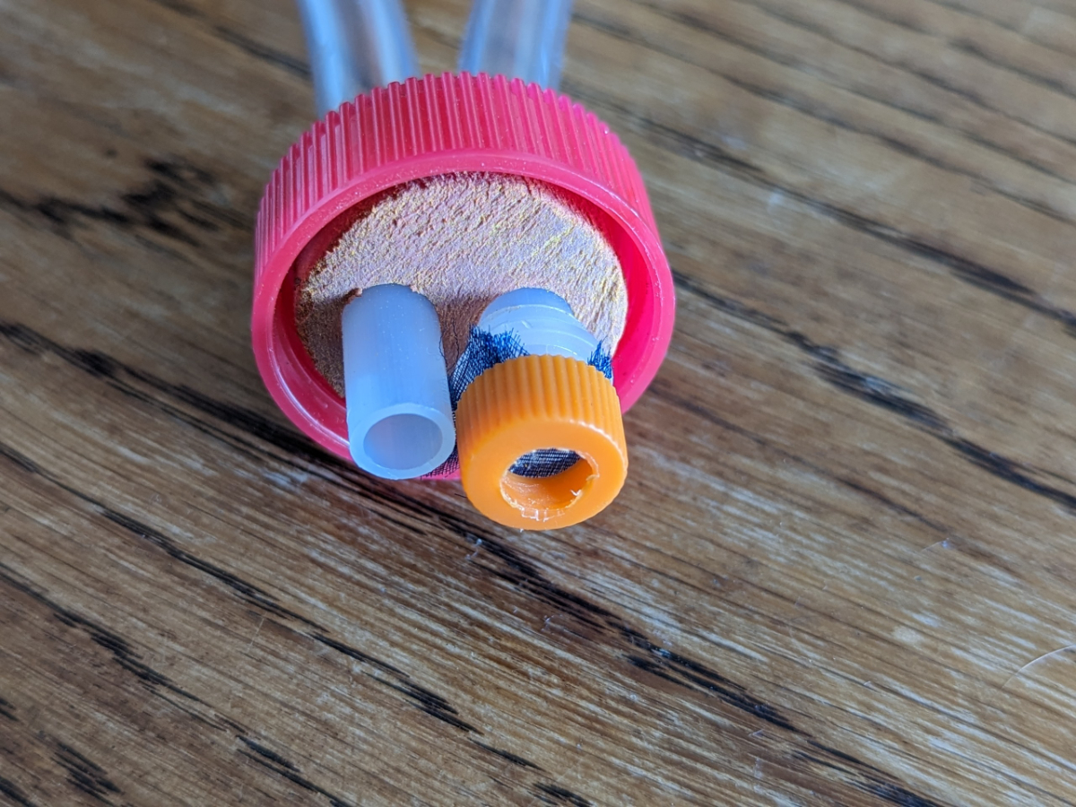 4) A questo punto di prende la provetta da 1,5 mm e si taglia la parte superiore, quella vicina al tappo. Si pratica un foro sul tappo di circa 6 mm, e poi si incolla la provetta a uno dei due tubi di plastica rigida con della colla polimerica, di solito molto resistente. Una volta che la colla si è seccata, si può togliere il tappo e inserire la garza.