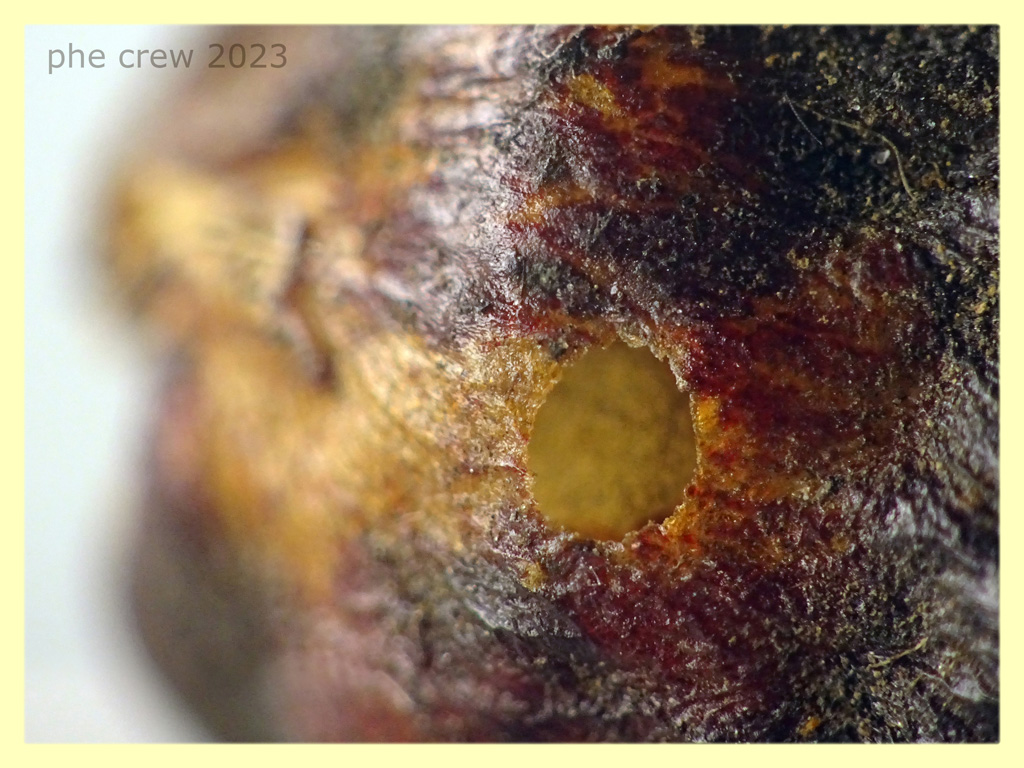 ...si nota bene anche il foro di uscita dell' Insetto. Purtroppo non ricordo il posto da dove li abbia prelevati e nemmeno l' anno, ma sicuramente nel Lazio e provincia di Roma.