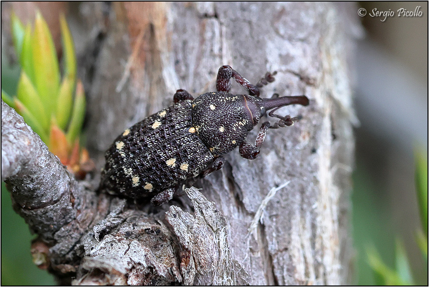 Mi sono letteralmente scontrato con questo Curculionidae che volava sulla cima del Monte Ragola a 1700 m. Sono poi riuscito a fotografarlo su un ginepro che con i suoi aghi può dare un'idea della dimensione (poco meno di 1 cm, penso).