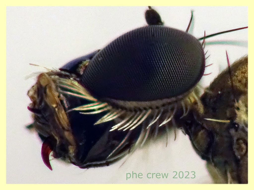 ...questo e' un esemplare fotografato in natura mesi fa', precisamente il 4.6.2023. Ho, da queste poche foto in natura, cercato grossolanamente di arrivare ad una identificazione....ma non ci sono riuscito. Quindi una ventina di giorni fa (infatti la data del post e' proprio quella di quel giorno) sono andato ad acciuffarne uno proprio sullo stesso albero di Eucalipto. Credevo che non fosse piu' periodo di svolazzamento....invece c' erano....circa una decina che giravano veloci zompettanti e a piccoli voli tutt' intorno al tronco per non farsi prendere. So che sono assidui sgranocchiatori di Collemboli e non solo....e qui l' idea.....ho scortecciato un po l' Eucalipto e decine di Collemboli alla rinfusa si misero a correre sul tronco. Eccoli ! subito in arrivo con le loro faccette da assassino che si avvicinavano veloci ai malcapitati insettini. Prima di colpirli prendevano la mira mettendosi in posizione parallela al tronco con l' addome per un secondo, praticamente alzavano anche le zampe posteriori che di solito in posizione di fermo o riposo sono quasi coricate assumendo la classica postura cioe' con la punta dell' addome quasi appoggiata alla superficie (come nelle seconda foto). Mentre erano indaffarati a rimpinzarsi ne presi uno. Non sapendo come descriminare maschio e femmina ho seguito le chiavi per le femmine e con un po di difficolta' (causa della mia apparecchiatura scrausa) si arriva al genere Medetera sp.. Dunque le foto che postero' piu' avanti evidenzieranno i dettagli per questo genere.