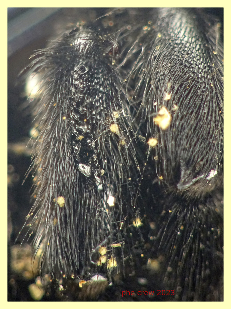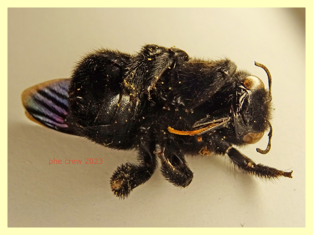 ...questo Imenottero l' ho trovato stecchito sul ciglio della strada, cosi' come da foto dalla testa all' addome misura circa 21 mm. e dalla revisione degli Xylocopinae di Francia e Belgio di Terzo, Iserbyt e Rasmont del 2007 arrivo a una femmina di Xylocopa violacea. Posto alcuni dettagli (quelli che sono riuscito a fotografare) per l' identificazione: segmenti antennali 12 (quindi femmina), scultura della testa, tibia posteriore e la sua "forma di calli" (non so come chiamarla).