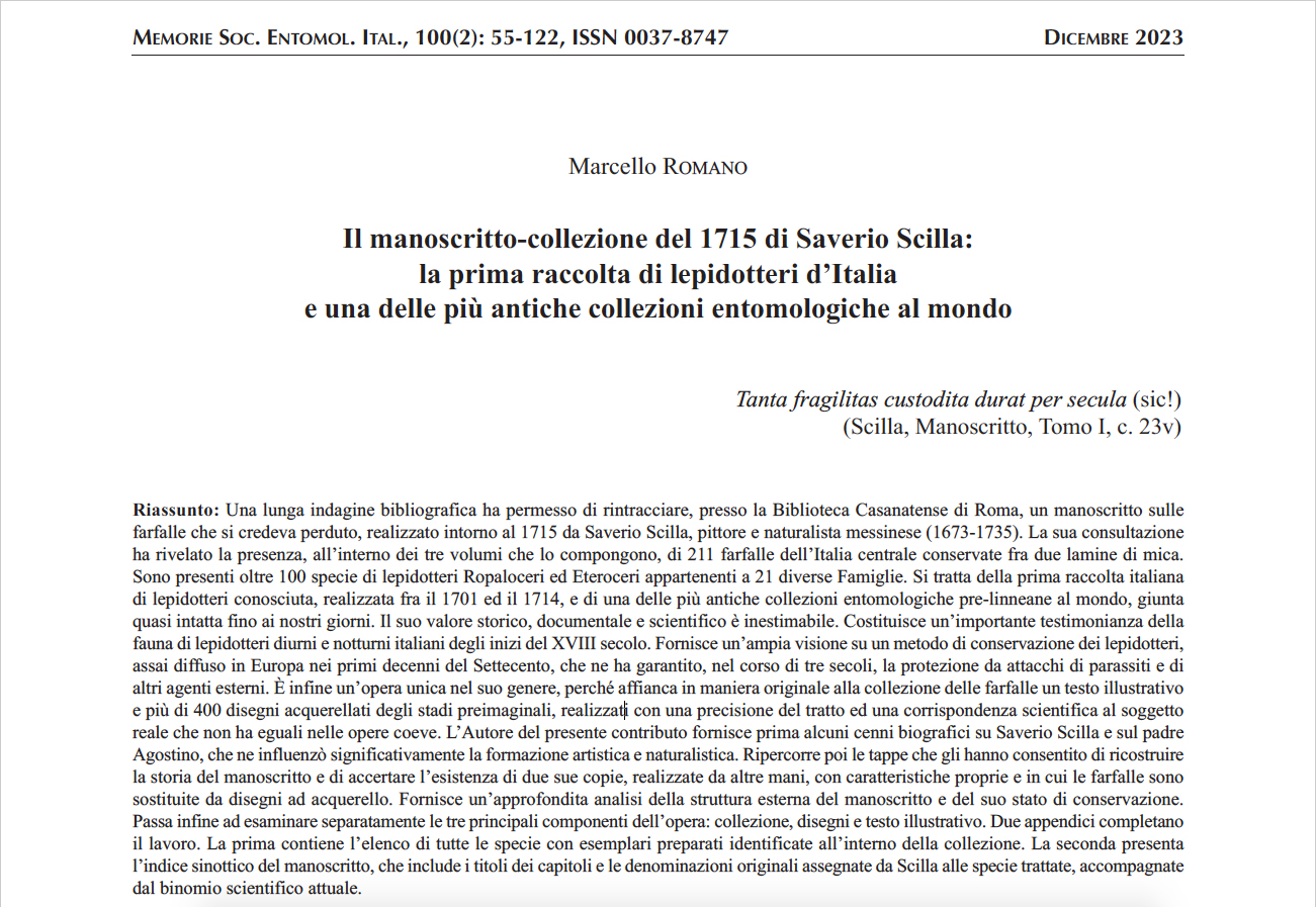 Il manoscritto-collezione del 1715 di Saverio Scilla: la prima raccolta di lepidotteri d’Italia e una delle più antiche collezioni entomologiche al mondo