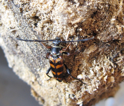 Maschio di Leptura aurulenta, sfarfallato oggi 26-VI-2010 da legna di Betulla (Betula pendula)