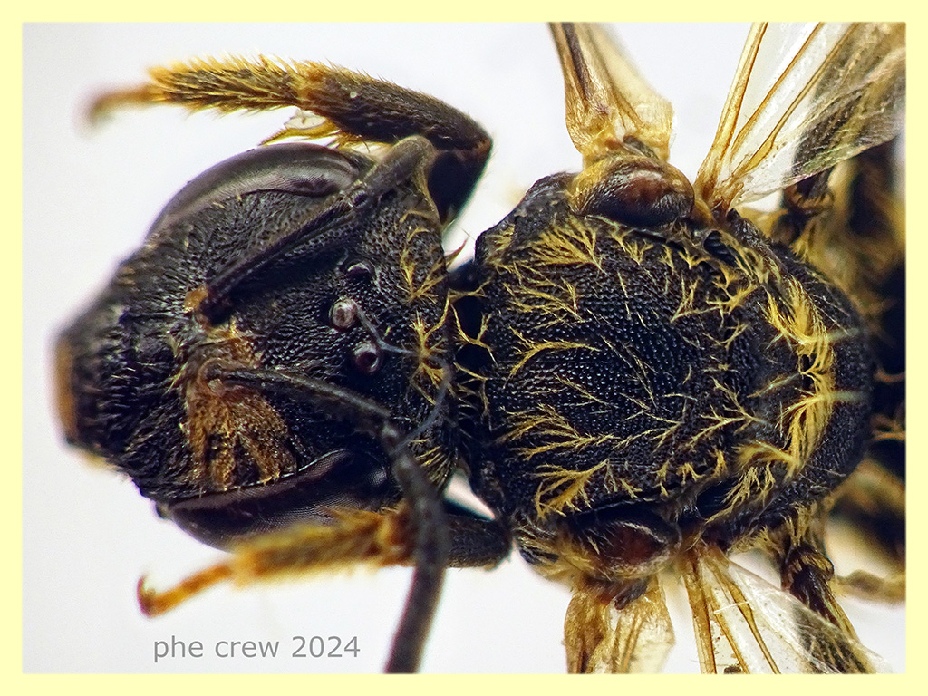 ...ho fatto due foto al volo, la fossetta sembra che ci sia. e poi la foto con la punctuazione del propodeo...comunque stavo leggendo atlashymenoptera.net - Halictus d'Europe e ce ne sono molte simili come habitus anche nella vicina Francia, ma non mi sono intrufolato a vedere se ci fosse un propodeum uguale al mio...