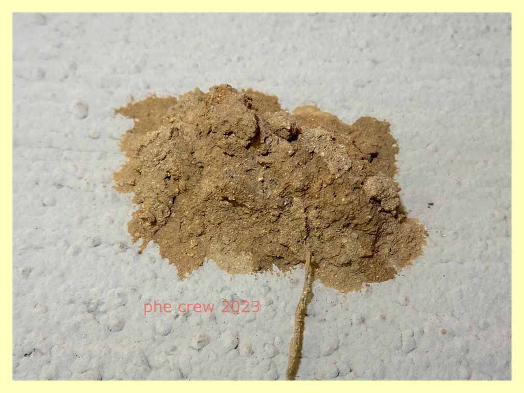 Il nido è verosimilmente di Sceliphron spirifex o Sceliphron caementarium, o forse di Chalybion vista la fattura rozza, ma le pupe sono di dittero. Anche le dimensioni lo confermano.