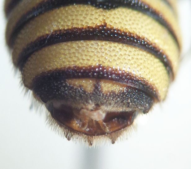 Ecco qua. Non mi pare di vedere discontinuità nelle mesopleure. Il tergite ultimo ha due cuspidi laterali ed una incisione al centro del margine apicale.