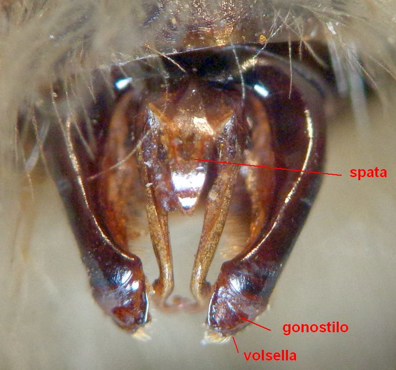 Tra i B. pratorum identificatimi da altri (con i genitali già estroflessi), questo maschio da me raccolto mi ha colpito per avere la punta del gastro a peli bianchicci e non rossi; un attento esame con chiavi sottomano, mi ha indotto a ritenere che appartenga alla specie jonellus, anche per le barbe mandibolari biancastre e non giallo dorate come in pratorum. I terminalia delle due specie sono molto simili ma mi pare, confrontandoli che in jonellus la spata sia tutta estremamente lucida (pochissimi micropunti), senza la microscultura a linee divergenti dalla bisettrice che si apprezza nella parte centrale in pratorum; il gonostilo appare apicalmente più rotondo e la volsella è quasi tutta nascosta dai gonostili, mentre è un po' più visibile in pratorum . Comunque le due differenze nella colorazione di gastro e barbe mandibolari sarebbero diagnostiche e le differenze negli apparati mi sembra di coglierli anche nelle foto del web. Purtroppo ho solo questo esemplare di jonellus quindi altri pareri sarebbero graditi.