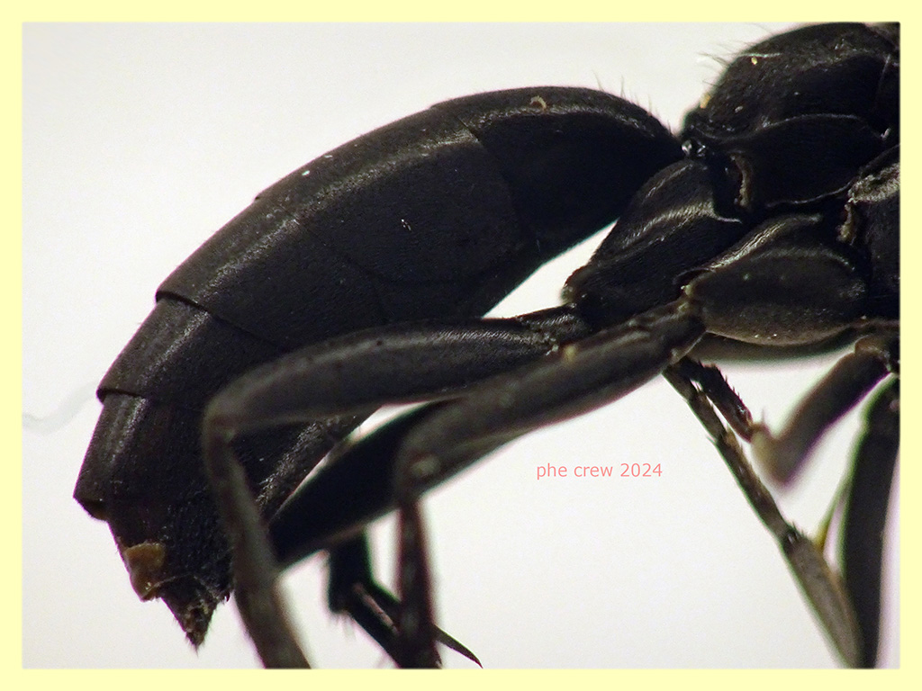 ...intanto posto queste foto, nella speranza che qualcuno del campo mi dica che dettagli fotografare ora che il soggetto e' secco.....poi lo ammollo e faccio altre foto. Non vedo dei peli irti sull' ultimo tergite, quindi forse non e' un Anoplius sp., e' caduto nel piattino giallo e cosi' come e' messo dalla testa alla punta dell' addome misura 9 mm.