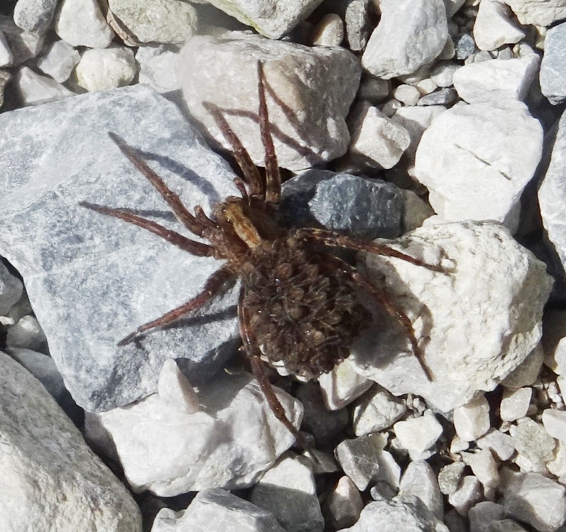 Hogna radiata è da escludere, anche per il rapporto di dimensioni tra madre e figli, oltre che per il disegno.