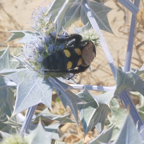 Ho trovato sulle dune (provincia di Pesaro, Adriatico) questa femmina di Megascolia con fronte di color arancio scuro, non gialla come gli esemplari osservati finora, e con un disegno diverso, molto più nero. Si tratta della stessa specie (Megascolia maculata flavifrons) o di una specie o sottospecie diversa?