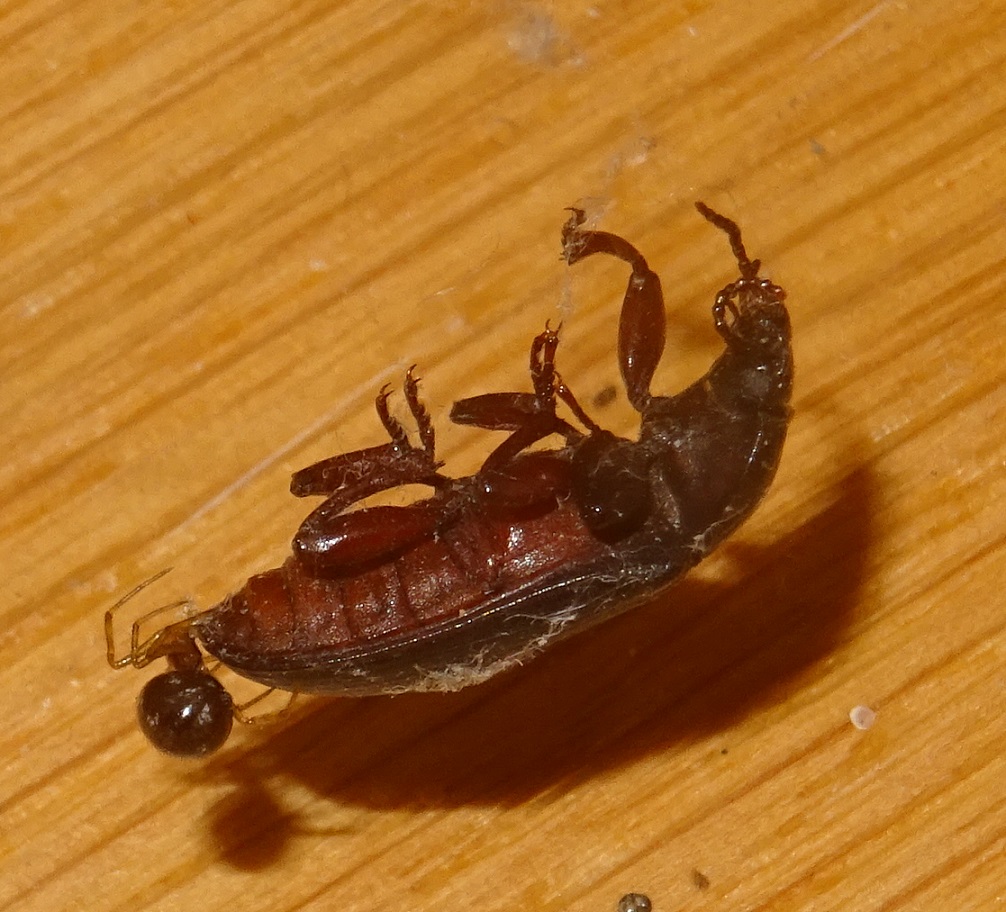 Salve, anche se minuscolissimo (pochi mm), ha catturato una balena! Forse il ragno è Steatoda triangulosa? E la sua preda? Grazie per ogni indicazione!