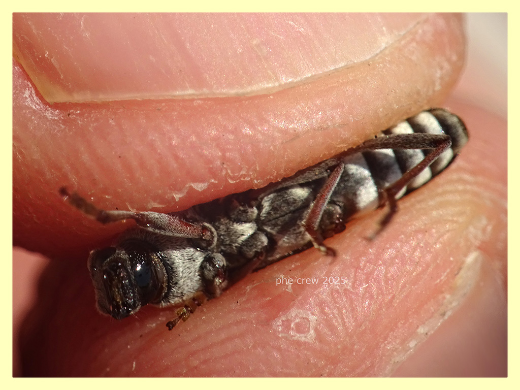 ....eccolo li' ! Ben aggrappato a una delle tante Graminacee in quel campo dove poche settimane prima si mimetizzavano gli Ascalaphidae. Mi avvicino lentissimamente con il mio 135 mm. nero come la pece sperando di non essere visto in quell' immenso beige. Gia' pregustavo come potesse venire la foto....bellissima ! Lui in primo piano e proprio quel beige omogeneo che gli faceva da sfondo. Invece no !....con l' occhietto vispo si accorse di me e sgambettando in un rantolo veloce si involo'. Io in quell' istante avendo capito che tutti i miei sogni fotografici stavano inesorabilmente svanendo.....istintivamente gli tirai un rovescio che nemmeno Sinner penso lo abbia mai dato cosi' forte !. Lui ovviamente carambolo' a terra nel fogliame e fili d' erba. Non si notava nulla, si scorgeva solo un movimento veloce....per bene si mimetizzava. In una frazione di secondo lo intercetto mentre cercava di arrampicarsi ....e' li' che non ebbe scampo ! Lo afferrai e lo tenni stretto tra due dita per fargli almeno due foto. A nulla servirono i costanti frigni e le molteplici smorsicate per liberarsi dal malcapitato incontro ravvicinato del quinto tipo !....li era e li stava....finche' non decisi che le foto fatte fossero appaganti. Finalmente ora libero...una strofinata alle zampe e antenne e via come un fulmine !