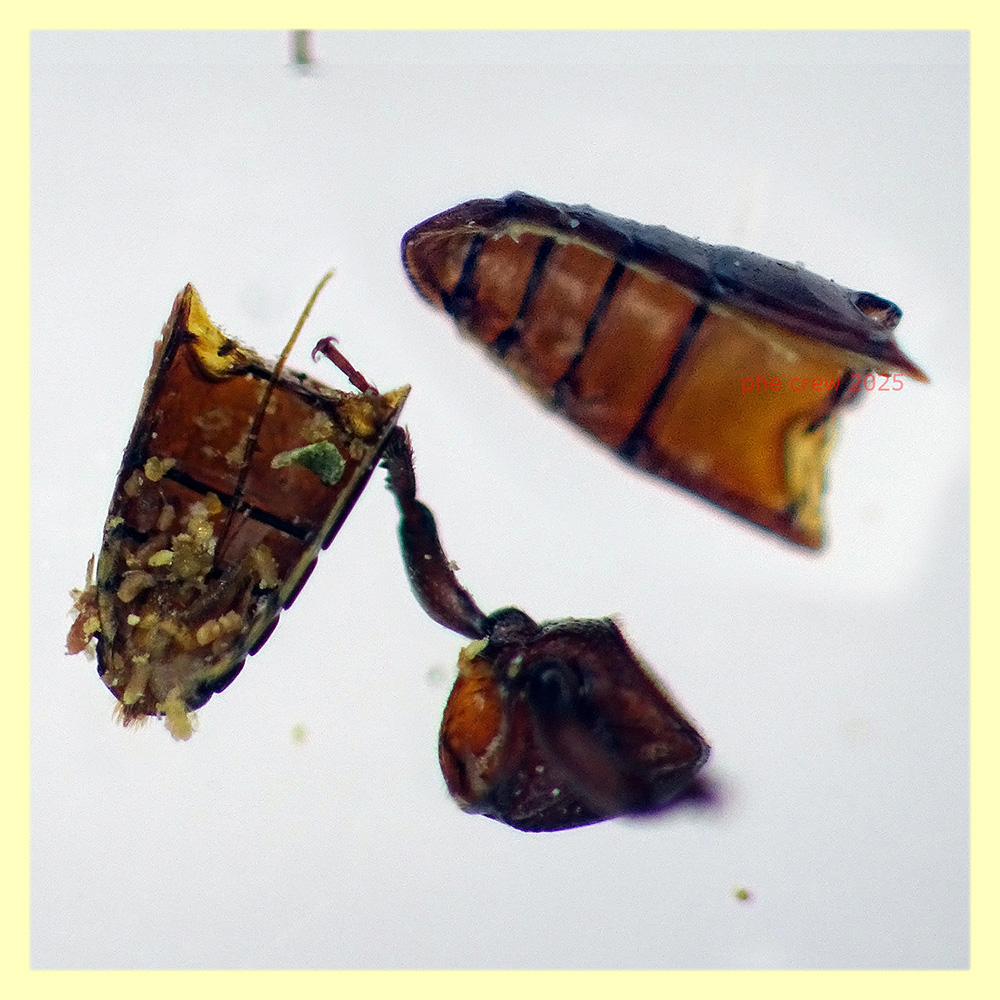 .......cosi' sembrava ....che fosse stecchito !, dopo quasi un mese, cioe' oggi, per curiosita' sono andato a contarmi quanti Ogmoderes avessi messo da parte........e sorpresa delle sorprese, trovai lui ....il Cryptolestes tutto arzillo e zompettante in mezzo a cio che rimaneva degli Ogmoderes....se li era sgranocchiati tutti !! Guardate qua cosa ha combinato !....ma non erano amanti delle derrate o comunque essenze vegetali ? Allora nel Ficus non mangiano solo i suoi tessuti, ma se trovano una larva o pupa di qualche altro Coleottero se lo sgranocchiano senza pensarci due volte !
