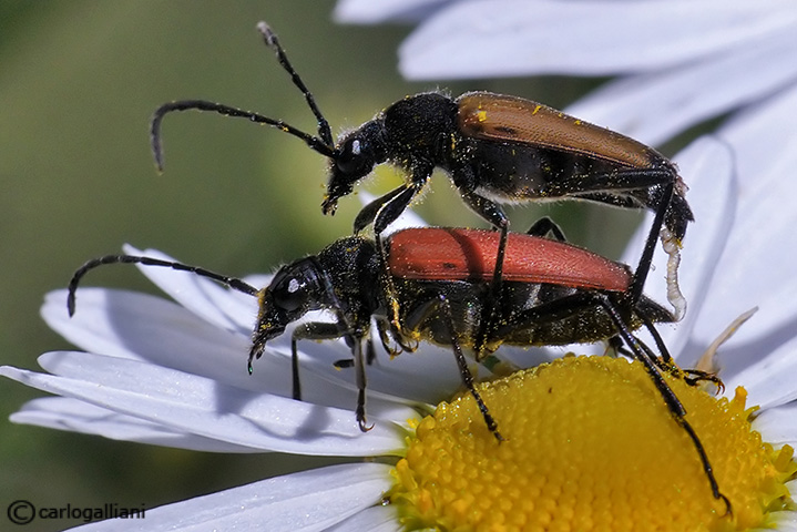 Si tratta di una coppia di Anastrangalia sanguinolenta (Linnaeus, 1761). Anch'io ho avuto occasione di fissare un'immagine quasi identica alla tua, nel 2006, in Trentino, nella Val Brenta.
