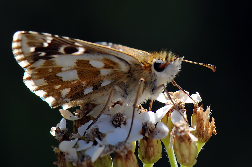 Come dicevo qui, dove Silvio ci mostra lo stesso esemplare (o almeno la stessa specie) dall'alto, sono convinto anch'io si tratti di Pyrgus serratulae (Rambur, 1839).
