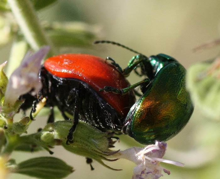 Ciao a tutti I coleotteri per me sono davvero sconosciuti!!!  Provo almeno ad individuare la famiglia, è un Crisomelidae?!?!?! e poi come mai alcuni esemplari sono verde metalizzato ed altri rossi? Dimorfismo sessuale? E nella foto in cui entrambi sono rossi? Matera 01-09-2010