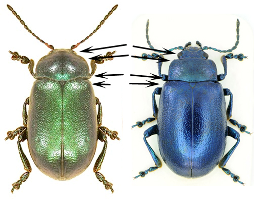 Andrea Pergine ha scritto: Andrea, in attesa delle immagini dell'edeago, inserisco qui il tuo esemplare messo a confronto con quello illustrato nel sito di Boroviec. Con le frecce indico 4 caratteri che non possono essere così diversi in due esemplari della stessa specie (e non prendo assolutamente in considerazione il cromatismo...). Non ho neanche indicato lo scutello, differente per forma e dimensioni.