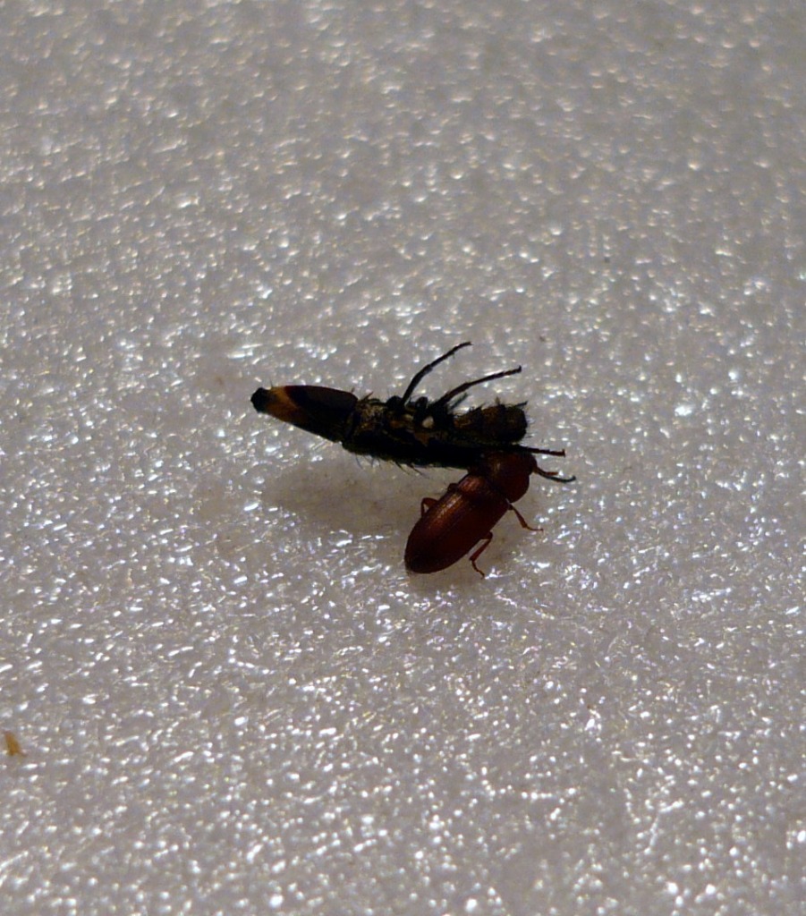 Ho scoperto tutto il clan che si era inserito in un "tentativo di diorama" fatto con delle cellette pupali di Rynchophorus. Inutile dire che mi hanno disfatto completamente una pupa secca,ma perfetta, e una larva che però non era un granchè.