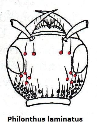 Le mie foto fanno veramente schifo,e le mie due lampadine da 40 watt sulla testa metallica del Philonthus non mi sono d'aiuto :sick: ma i sei pori li ho visti distribuiti come dal tuo disegno.