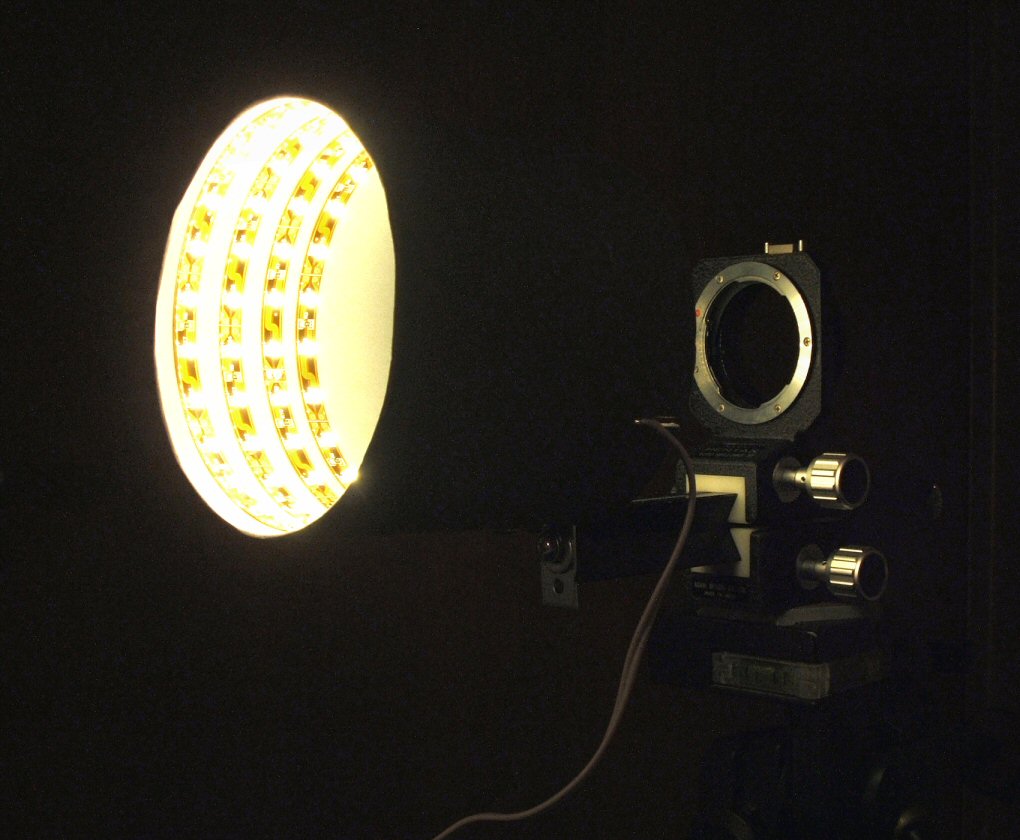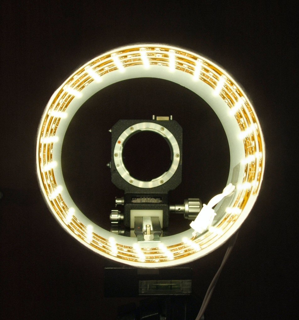 Quei led sembrano emettere un fascio di luce molto largo, quindi dovrebbero andar bene anche puntati così. Dovresti solo provare a metterli su una calotta emisferica, o chiamiamola semplicemente cupola, con un foro alla sommità sufficiente per il passaggio dell'obiettivo (o anche più piccolo, se usi una focale lunga che ti permette di fare macro restando ad una certa distanza dal soggetto, senza far entrare l'obiettivo nella cupola, che sarebbe meglio anche per evitare luci indesiderate sulle lenti).