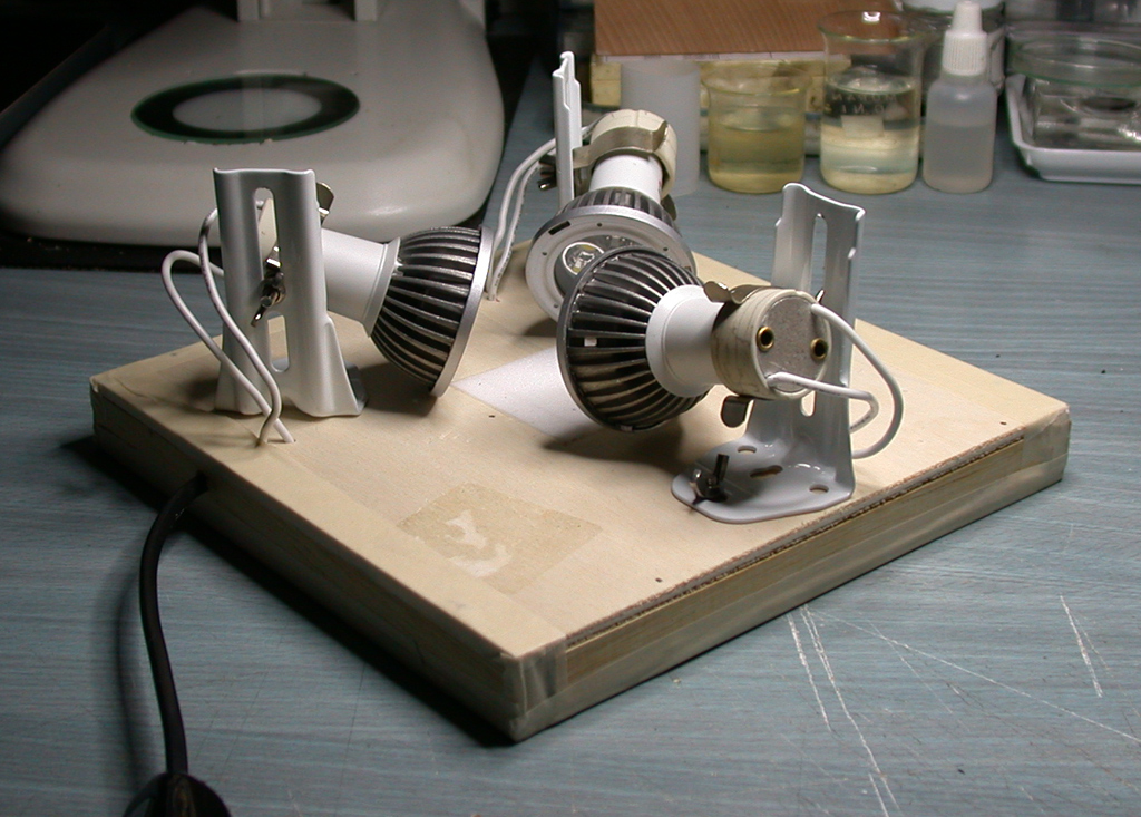 Per lo stativo ora uso invece 4 faretti a led, ma non del tipo ad alta potenza, bensì quelli normali, sempre pure white, con 60 led ciascuno. Oltre ad essere più economici, scaldano ancora meno di quelli CREE e hanno una luce più diffusa, dal momento che la superficie di 60 led è maggiore di quella di 1 o 3 ad alta potenza. Io li ho presi con attacco E14 (quelli per il microscopio sono invece E27), ma ci sono con tutti i principali tipi di attacco.