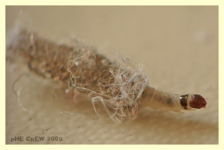 Mi sa che anche le larve sono Tinea pellionella, guarda queste immagini di confronto: www.entomart.be/INS-0232.html