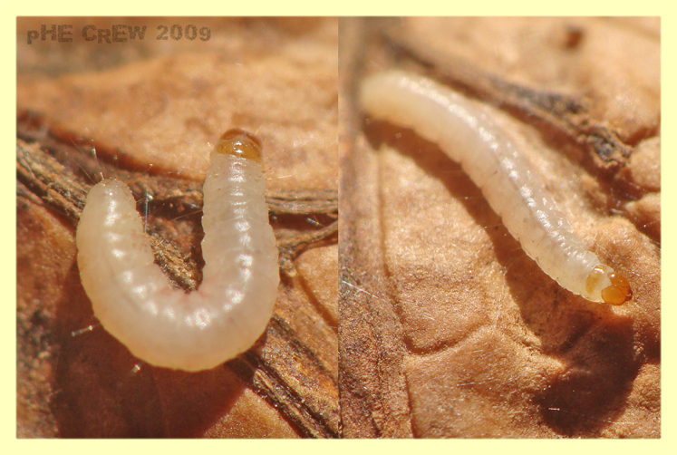 La larva sulle noci è molto probabilmente del Tineide Nematopogon granella; la larva nell'astuccio è di Tinea pellionella; gli adulti in copula sono di Plodia interpunctella!