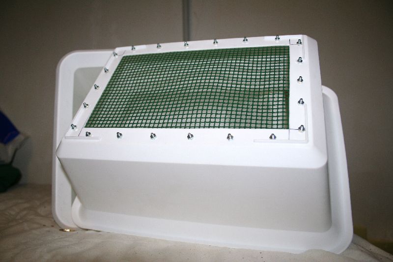 Ho comprato due vasi di plastica da 35 cm circa di diametro, a cui ho tagliato via il fondo con un paio di cesoie. Al suo posto ho incollato due pezzi di rete di plastica rigida: una con maglie da poco più di 1 cm di diametro, l'altra di circa 3 mm. In questo modo ho due vagli che possono essere usati sia sul campo, sia a casa. Sia singolarmente, sia insieme. In pratica, quando li uso sul campo, metto i due vasi uno dentro l'altro, con sopra quello con la rete più grande, e questi li metto dentro un recipinte di plastica a sezione quadrata, un po' più alto dei vasi e largo circa come loro. Tenendoli impilati, metto un po' di foglie marce o altro detrito nel primo vaso. Agitando e scutendo, il materiale si separa in tre frazioni: