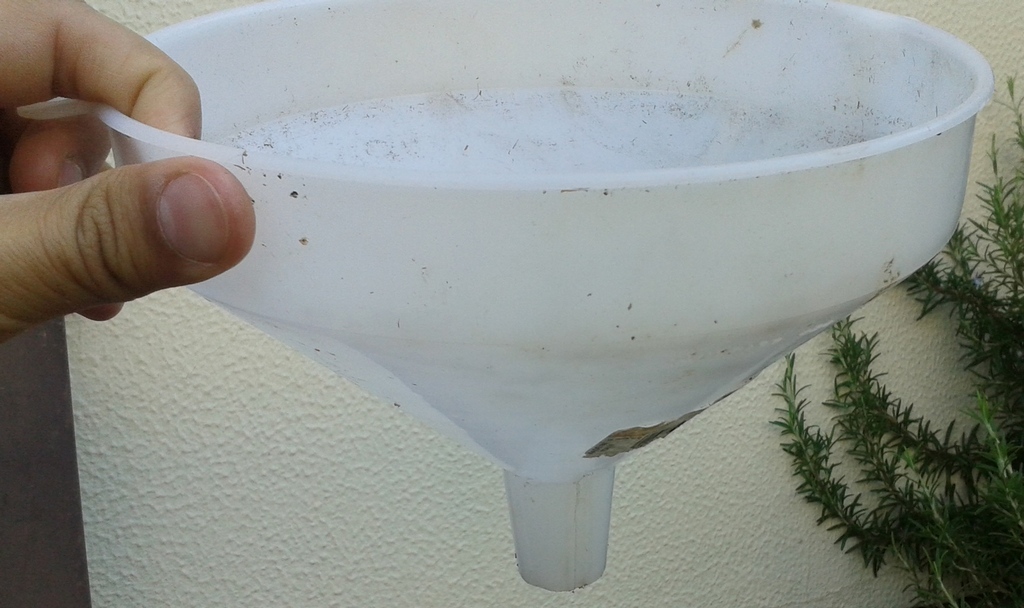 Elemento 2: grosso imbuto a cui ho accorciato la "punta" (costo: sui 2 euro)