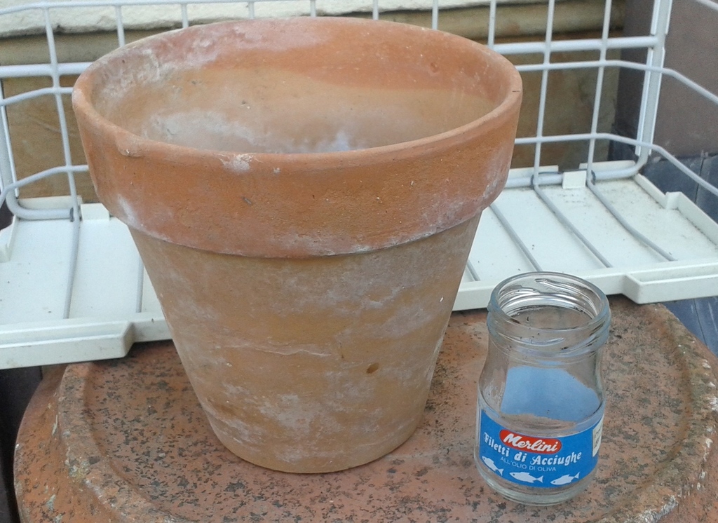 Elementi 3 e 4: un vecchio vaso da fiori, che ha la sola funzione di sostenere l'imbuto, e un vasetto di vetro, che invece riceverà le bestioline :p (costo 0 perché ovviamente di recupero)