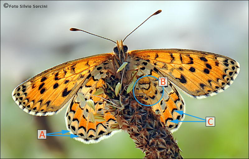 Si notino i punti neri marginali di forma più o meno sub-triangolare in Melitaea trivia (A) e di forma tondeggiante in Melitaea didyma (A), la presenza della nervatura cello-discoidale in M. trivia (B) assente in M. didyma (B) e le lunule nere sottili e quasi unite tra loro in M. trivia (C), più spesse e separate in M. didyma (C).