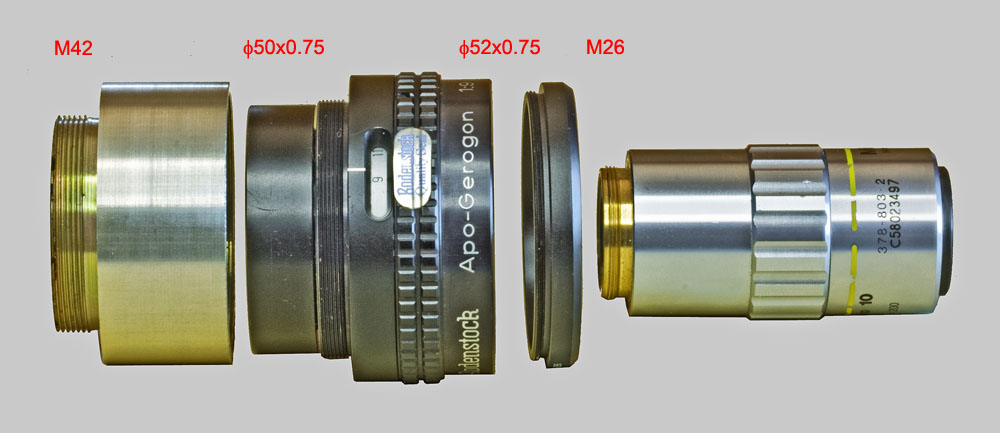Più o meno sono equivalenti. Ad esempio io uso un adattatore step-down 52-42, abbinato ad un altro step-down 42-RMS. Il primo si trova ad un paio di Euro, il secondo intorno ai 10 Euro. Oppure direttamente uno step-down 52-RMS. Si trova meno facilmente, ma si trova comunque, senza bisogno di farselo fare apposta. Adattatori per ob. da 26 mm sono invece più difficili da trovare, ma a volte si trovano anche su Ebay (ce ne sono anche 26-RMS e RMS-26, per convertire gli attacchi dei due tipi di obiettivo da microscopio.
