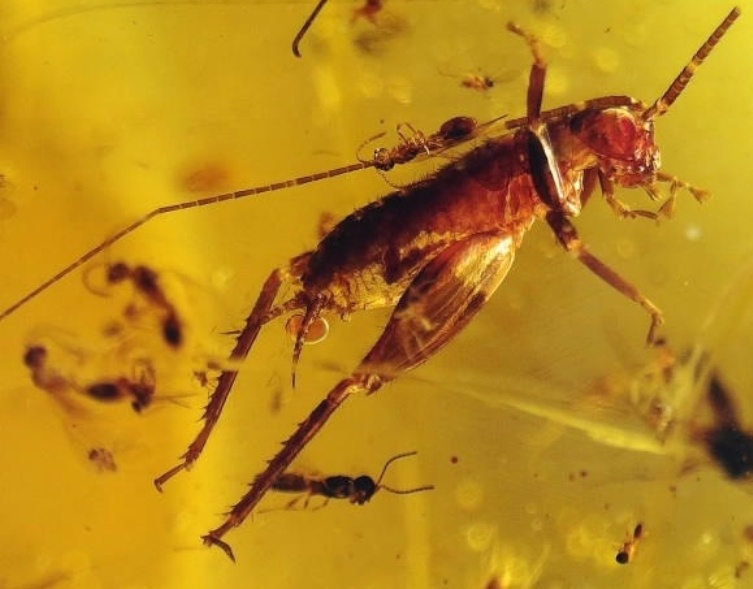Psocottero con vicino una zampa di blatta nell'ambra cretacea del Myanmar