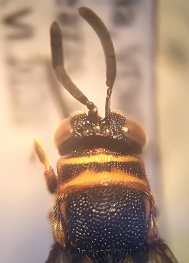 Da quel che capisco, l'apice del clipeo ha due lobi arrotondati e, tra di essi, un minuto dentello acuto. Lo scutello, apicalmente, è arrotondato (al più molto debolmente prodotto nel mezzo).