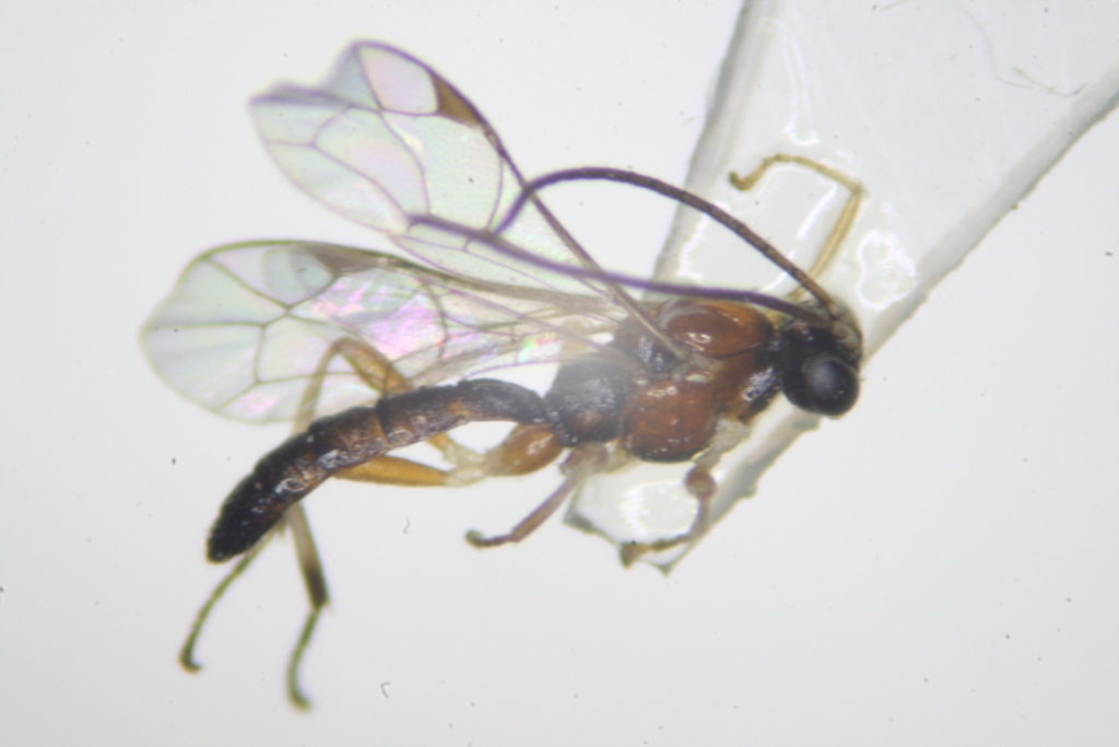 Si tratta di un Ichneumonidae sottofamiglia Pimplinae. Non si vede benissimo, ma mi sembra di vedere sui tergiti addominali, almeno il II-III-IV, delle forti incisioni che delimitano una sorta di area romboidale al centro degli stessi. Se sì, si tratta di un maschio di Zatypota sp. (per la specie bisogna vedere meglio l'esemplare).