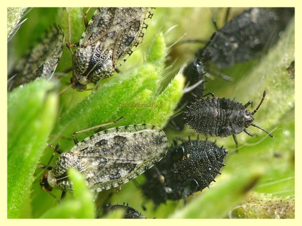 ....premetto che non conoscevo i dettagli da fotografare, poi a casa ho letto Faune De France 69 - Tingidae e mi sono arrangiato con cio' che si poteva estrapolare dalle foto. Seguendo le chiavi arrivo a Dictyla nassata, anche per la pianta ospite Echium sp., le spine cefaliche che sono chiare (frecce bianche), la larva stadio V che ha 3 processi sui lobi emelitrali (frecce blu) e 3 processi ai margini laterali del pronoto (frecce rosse).