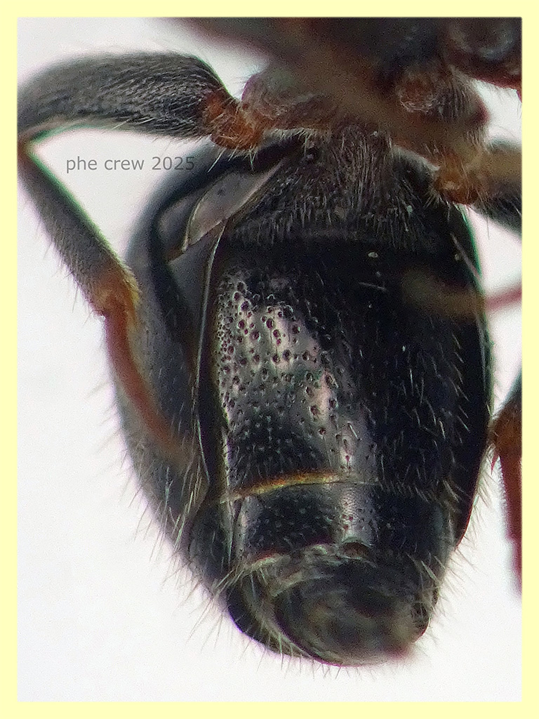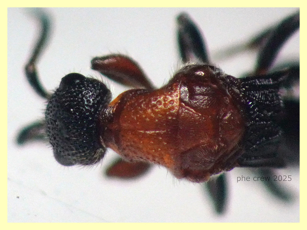 ....purtroppo non credo si possa andare piu' avanti di cosi', ho anche cercato di fotografare l' hypopygium...ma l' ho inesorabilmente distrutto. E' una femmina al 100 % ho visto l' aculeo al macro. Sono convinto percio' che sia una femmina alata di Heterocoelia sp. ....daltronde cio che si vede mi porta a lei. Alcuni punti li ho gia' citati sopra....sono partito dagli ocelli ....secondo la mia ipotesi iniziale con l' ocello anteriore internamente alla linea (fig. 19) ci sono le specie Sulcomesitius sp. e Hamusmus sp. , ma le femmine di questi sono testa, torace e propodeo rosso per la prima, corpo tutto nero per la seconda. Con l' ocello esterno (fig. 20) anche se dovessi inclinare per sbaglio non ci arriverebbe mai in quella posizione, invece per quello frontale (fig. 22) e' abbondantemente in avanti per confondersi ....quindi li ho scartati a priori. Rimane la fig. 21 dove inclinando leggermente il mio soggetto la linea immaginaria taglia perfettamente in due l' ocello anteriore. Nel pdf di Argaman 2003 con la figura 21 abbiamo le seguenti specie: Heterocoelia sp., Gerbekas sp., Botoryan sp. e Pycnomesitius sp.. Di queste specie citate pero' solo Heterocoelia sp. e Gerbekas sp. si trovano nel Paleartico (letto nel pdf di Barbosa, Hermes, Lepeco del 2022) e posso sicuramente inserire la mia femmina tra le Heterocoelia sp. che hanno mesoscutum rosso mentre le femmine di Gerbekas sp. lo hanno nero. ....se qualcuno vuole convalidare o smentire i miei scritti sono ben accetti ! ....le ultime foto