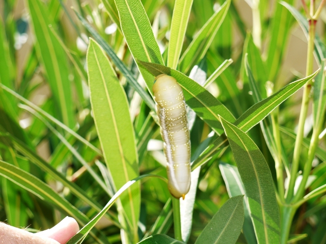 che bruco è?Foto scattata il giorno 11/9/2010 in Trieste, periferia della città in rione Gretta. Lunghezza circa 8-9 centimetri, diametro circa 1,5-1,8 centimetri. Piuttosto grande vero? Nella foto numero 02 si confronta parzialmente con il mio pollice. L'ho pizzicato che mangiava voracemente le tenere foglie dell'oleandro in giardino ... Che specie di bruco è? Grazie in anticipo per la risposta. Giorgio