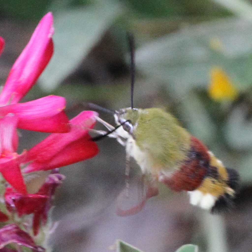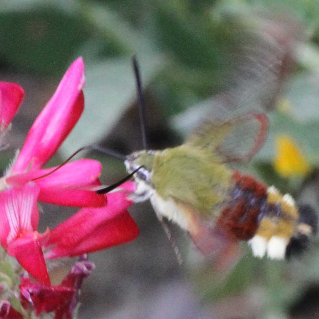 In un primo momento avevo pensato a Macroglossum stellatarum; il comportamento 'da colibrì' e le dimensioni erano simili. Poi però mi sono accorto, da quel poco che si vede dalle foto, che i colori sono diversi e le ali sono trasparenti, quindi non è lui, ma ne so troppo poco per proporre altre ipotesi.