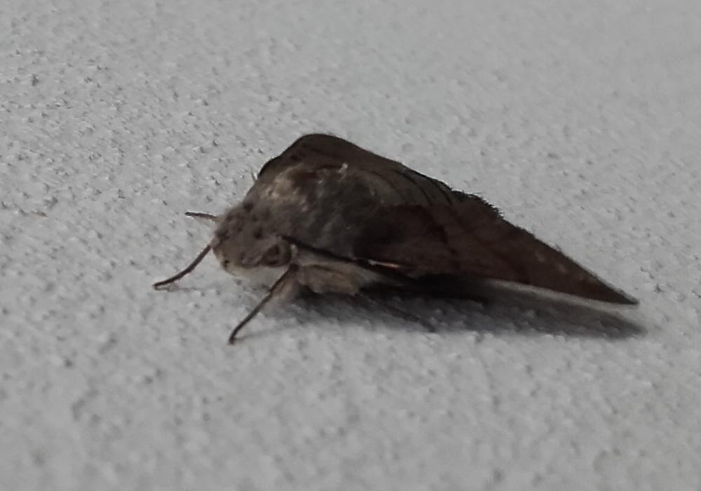 questa è una foto di più di un mese fa, in giardino. A meno che non soffra di alopecia, la falena deve aver avuto una brutta avventura. Dimensioni ragguardevoli, almeno 3 cm di lunghezza. Vista di giorno, non in volo.