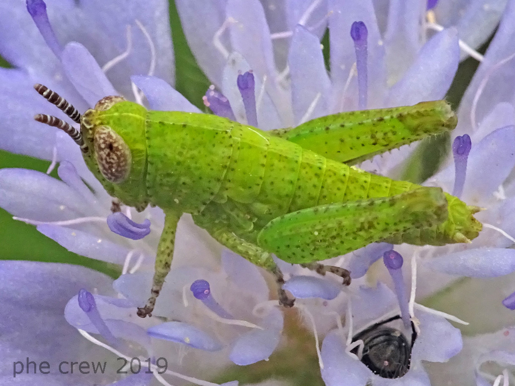 ...non sono riuscito a capire a quale specie appartenga questo giovane Acrididae. |