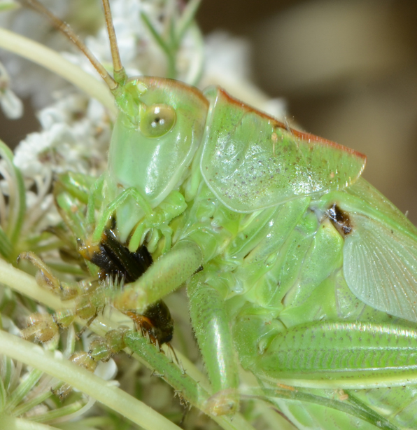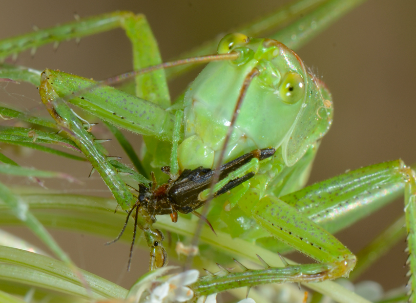 Tutti gli Ensiferi si nutrono, almeno sporadicamente, di altri insetti: infatti bisogna stare attenti a cercare di non mettere più di un Ensifero vivo dentro una provetta quando li raccogli, altrimenti c'è il rischio che si azzannino tra di loro; una volta stavo raccogliendo delle Eupholidoptera e ad una si era staccata una zampa, l'ho lasciata nel contenitore pensando di riattacarla mentre la preparavo ma non è stato possibile: in meno di dieci minuti se l'era totalmente divorata!