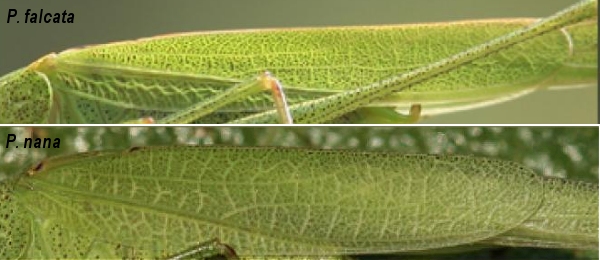 I caratteri distintivi delle due Phaneroptera italiane risiedono in prevalenza nella robustezza del corpo nel suo complesso. La P.nana è molto più corta e tozza rispetto alla falcata.