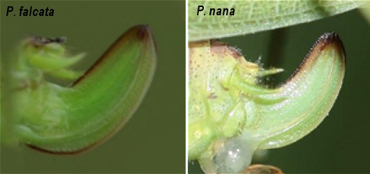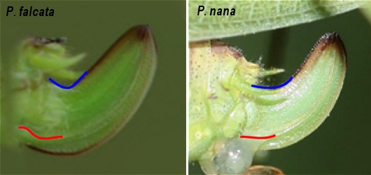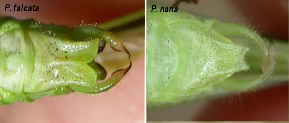 - ovopositore a curvatura leggermente ad angolo, con una lamina sinuosa alla base > P. falcata