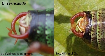 I cerci non corrispondono a quelli del maschio di B. serricauda, nel quale si restringono gradualmente dalla base verso l'apice. Si tratta dell'altro rappresentante di questo Genere presente in Slovacchia e cioè Barbitistes constrictus Brunner von Wattenwyl, 1878. E' una specie considerata molto rara, che si differenzia dal serricauda per avere la testa leggermente più larga (circa uguale alla lunghezza del pronoto) ed il pronoto più incavato a forma di sella. Nel maschio i cerci sono dilatati sul lato esterno nella regione subterminale e si restiringono bruscamente nella parte apicale. P.S.: non Tettigoniidae, ma Phaneropteridae. |