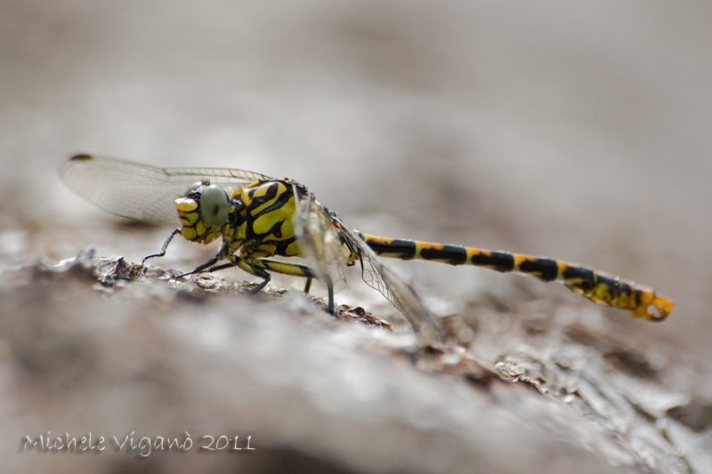 ieri, e non me l'aspettavo proprio, mentre cercavo tutta un'altra libellula ho trovato questo bellissimo maschietto di (fin qui sono abbastanza sicuro) Onychogomphus forcipatus posato sopra una catasta di tronchi tagliati.
