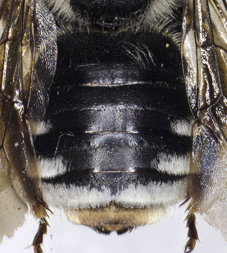 Questa è Eucera proxima, una specie di cui ho raccolto tre o quattro maschi e solo questa femmina. Fa parte del gruppo di specie in cui le femmine hanno solo la banda sul quarto tergite intera, che include ad esempio longicornis e interrupta, ma si riconosce per il mesoscuto lucido tra i punti, i peli dell'addome bianco candido e la punteggiatura dei tergiti molto sparsa, con interspazi maggiori dei punti.