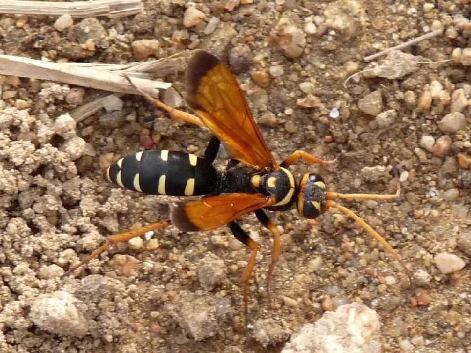 La mia idea è che fosse un Batozonellus lacerticida, ma mi è stato fatto notare che la specie della preda non è tra quelle normalmente cacciate da tale pompilide, e inoltre che il Batozonellus lacerticida ha 5 strisce addominali, mentre quello da me ritratto ne ha solo 4 (apparentemente).