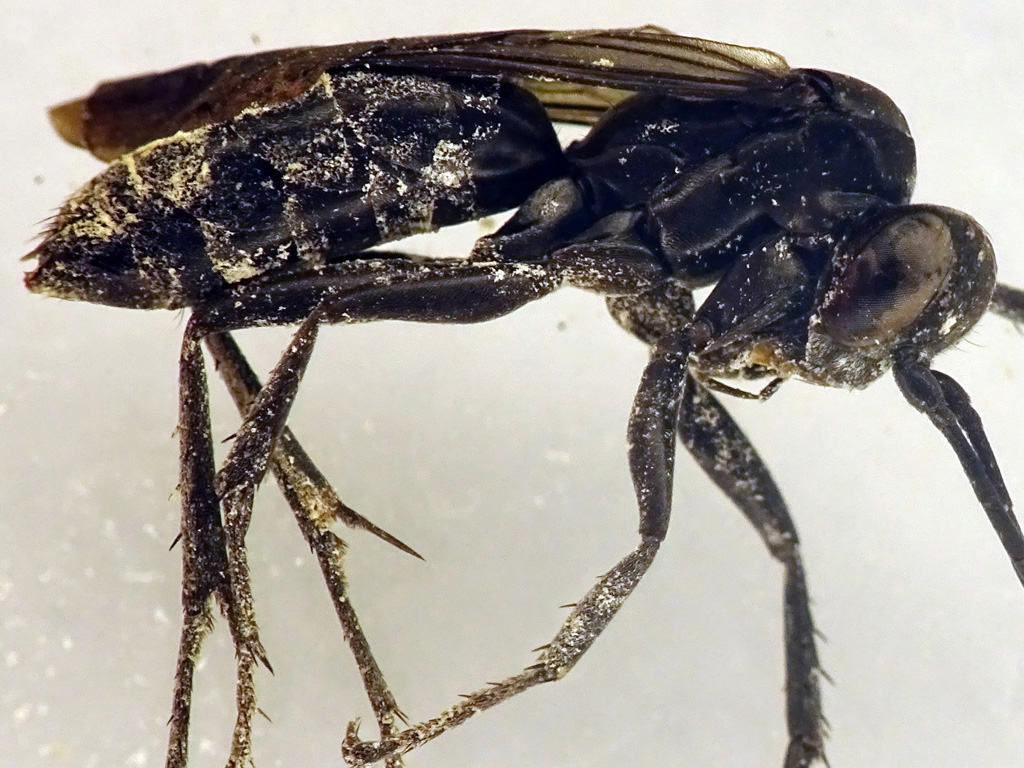 Non avevo notato i peli-spinosi dell'ultimo tergite che caratterizza il gn. Anoplius al quale dovrebbe appartenere; la metà delle specie italiche ha addome unicolore ed i caratteri da visualizzare sono difficili in foto; se sto alla forma della seconda cellula submarginale (quasi triangolare) e del clipeo (che pare corto), dovrei dire A. nigerrimus (Scopoli), specie molto simile a A. caviventris Aurivillius, ma come spesso accade in questi aculeati è un insieme di caratteri che va valutato. I peli-setole di cui parli penso siano quelli visibili sul labrum e non sono diagnostici. :hi: