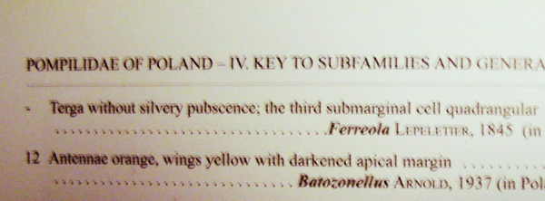 Batozonellus ---> Sottofamiglia Pompilinae: seconda cella sub-marginale priva di tasca basale; spine all'apice delle tibie (non gli speroni) di taglia regolare ed uniformi; secondo sternite diviso in due da un solco trasversale.